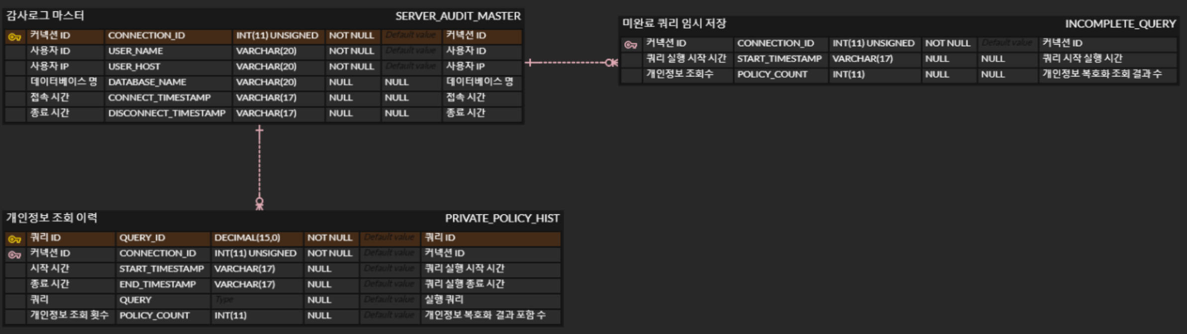 감사 로그 관련 테이블이 서비스와 같은 database와 분리 해서 별도의 database에 있는 것이 좋을 것 같습니다.