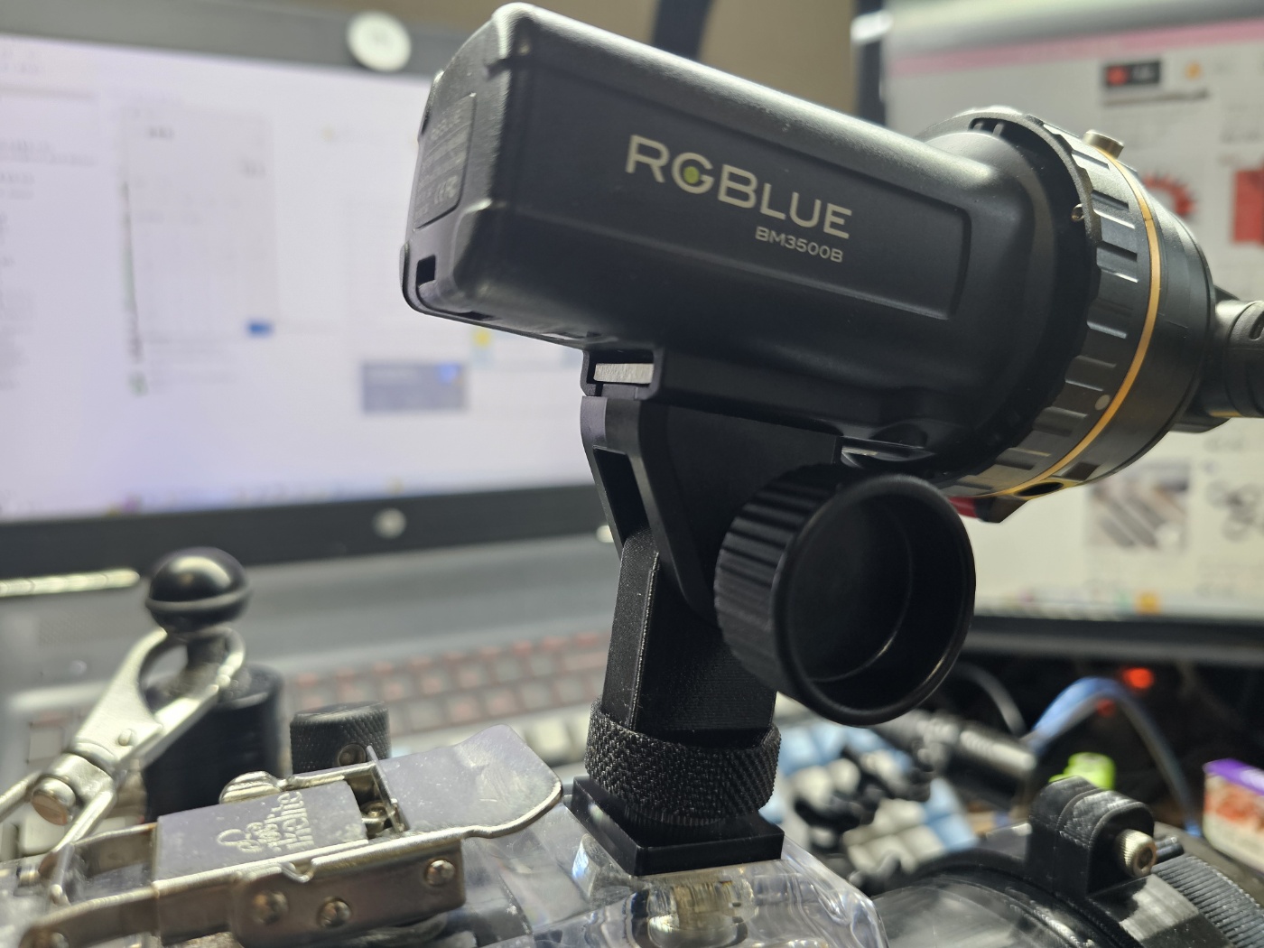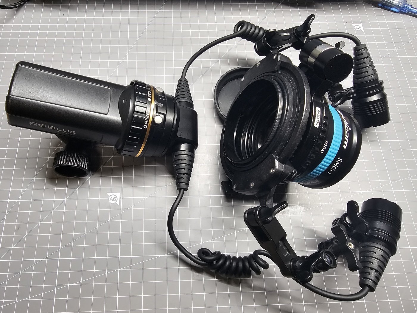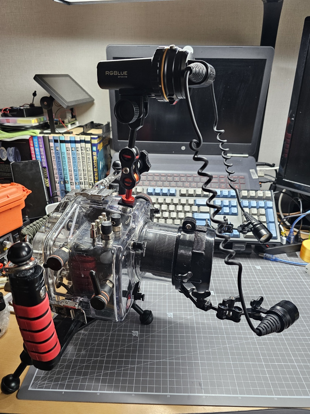 다만... 라이트도 렌즈도 67mm 나사식 마운트라 제가 사용하는 구형 아이켈라이트 4Lock 방식 평포트에는 마운트를 할 수 없었습니다. 아마도 나사식 마운트가 나오기 전에 모델이거나, 4Lock 의 채결방식이 스프링으로 브라켓을 지지하는 형태라 경통에 무게가 걸리면 누수의 위험성이 있기 때문에 렌즈 경통에 무언가를 달 지 못하도록 한 것 아닐까 싶습니다.