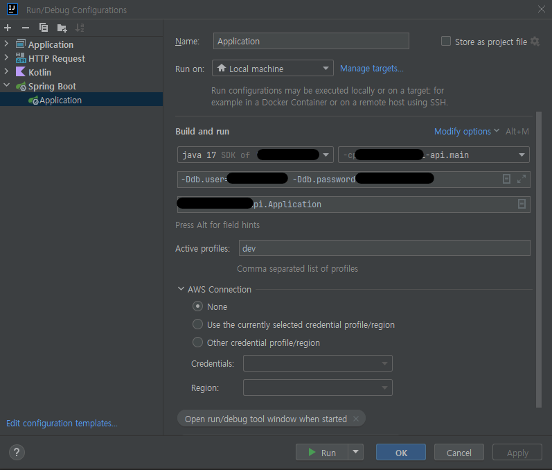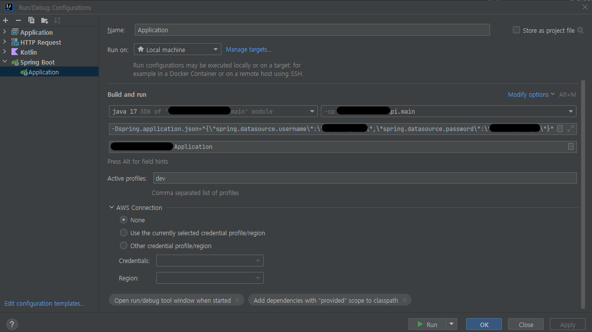 통합개발환경 Run/Debug Configurations 의 VM 옵션에 아래 내용을 추가