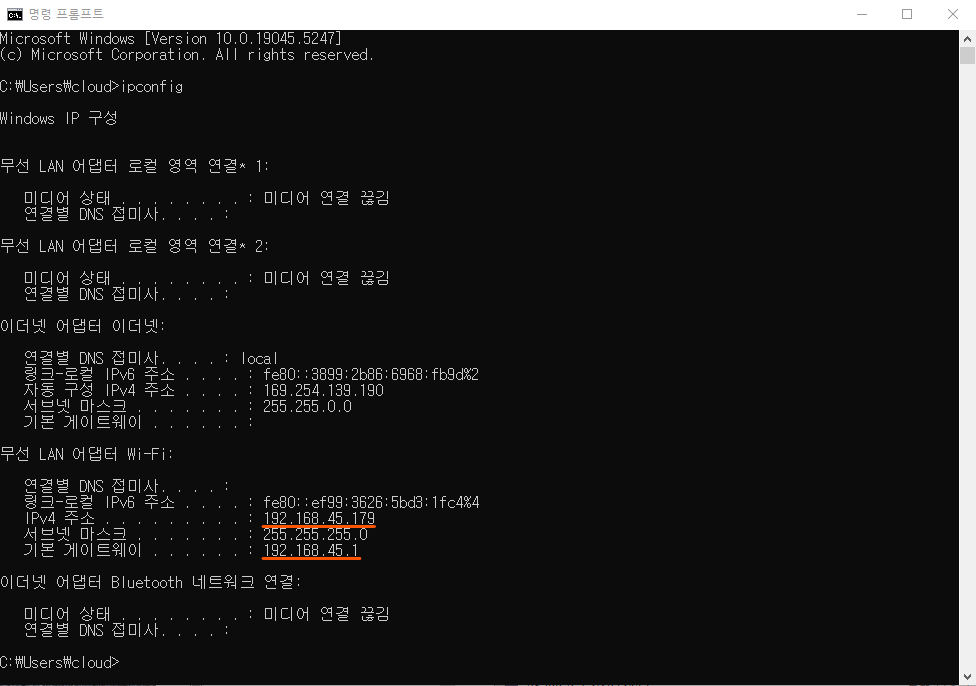 공유기가 192.168.45.1 이고 내 PC는 wifi를 통해 192.168.45.179 IP를 할당 받았다.