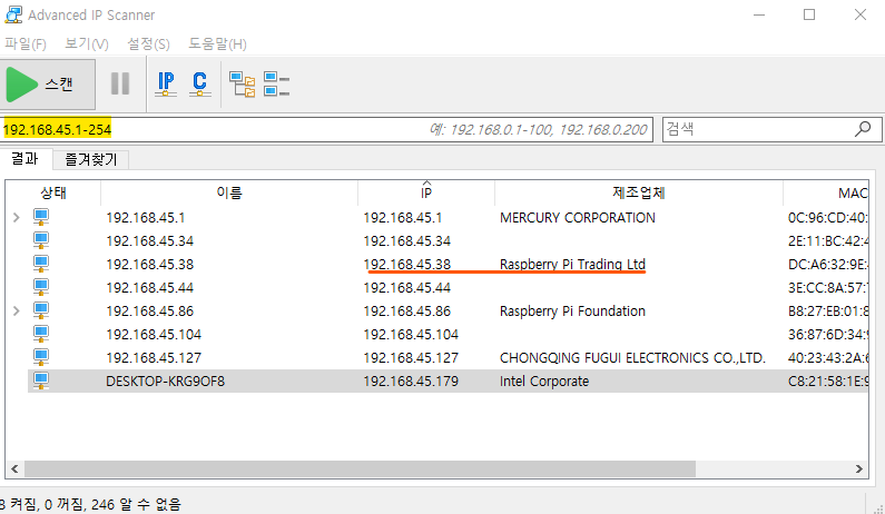 인터넷에 연결된 기기가 많을 수록 목록이 많이 나옴, 새로 설치한 Raspberry Pi는 192.168.45.38에 할당된 Raspberry Pi Trading Ltd 로 추정된다.