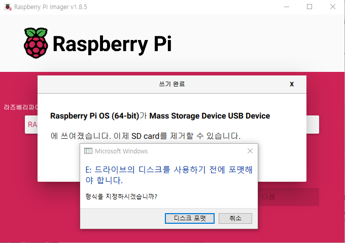 이미지 쓰기가 완료 되면 완료 메시지와 함께 포멧 경고창이 뜬다.