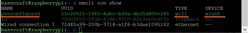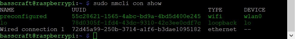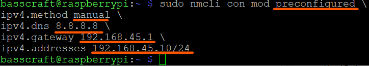 $ sudo nmcli con mod preconfigured ipv4.method manual ipv4.dns 8.8.8.8 ipv4.gateway 192.168.45.1 ipv4.addresses 192.168.45.10/24