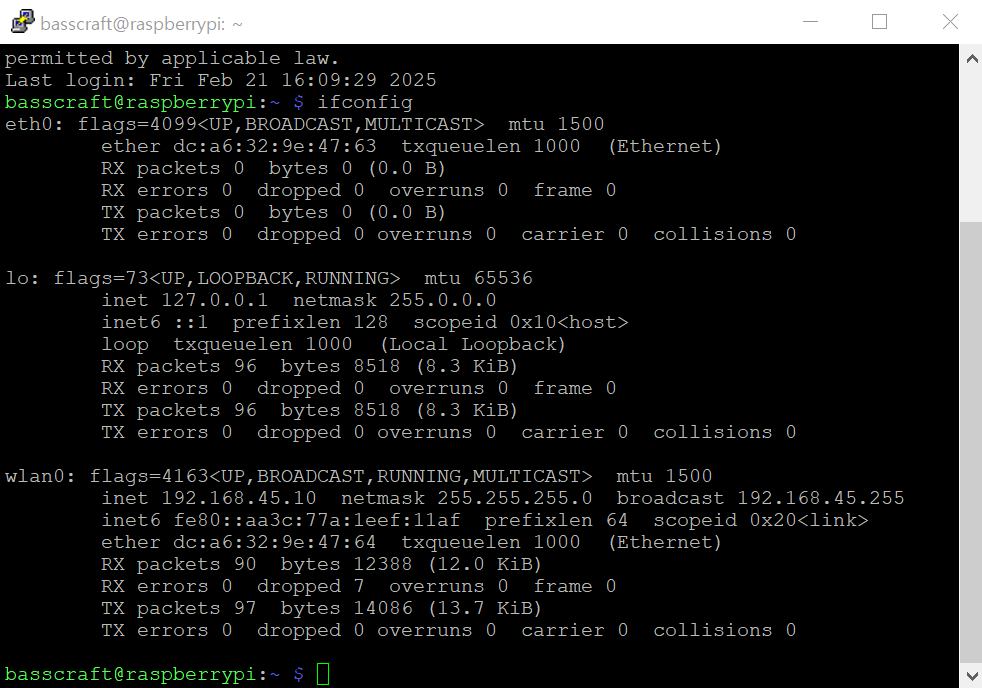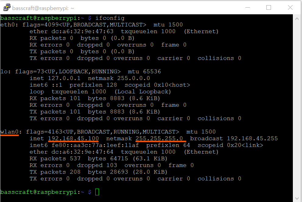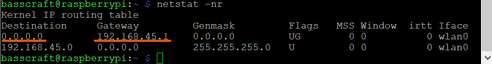 wifi 연결로 잡혀 있으므로 인터페이스명은 wlan0, 현재 DHCP로 할당된 IP는 192.168.45.100, 서브넷마스크는 255.255.255.0 입니다.