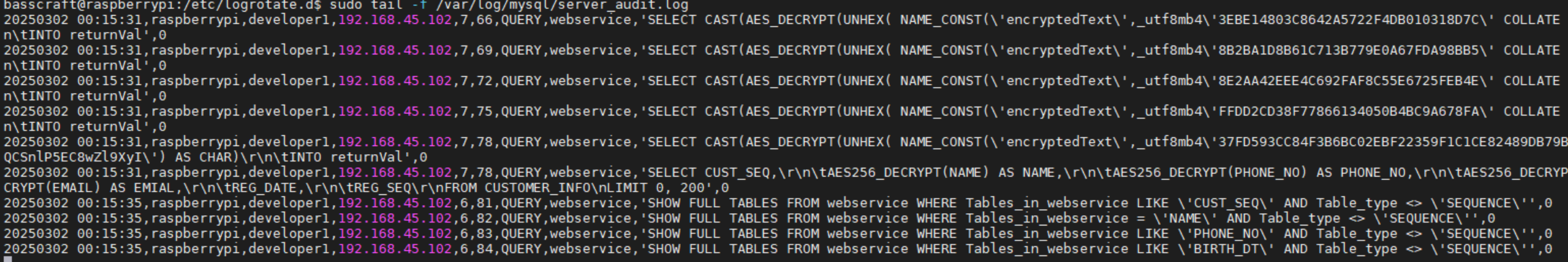 /var/log/mysql/server_audit.log 파일을 보면 로그가 잘 남고 있습니다.