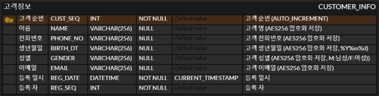 사전 배경고객 정보 저장시 개인정보 컬럼(이름, 생년월일, 전화번호, 계좌번호... 등등) 암호화 저장이 필요함암/복호화가 가능한 방식으로 최소 권고 사항을 봤을 때 AES128 이상 적용해야 함어