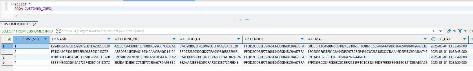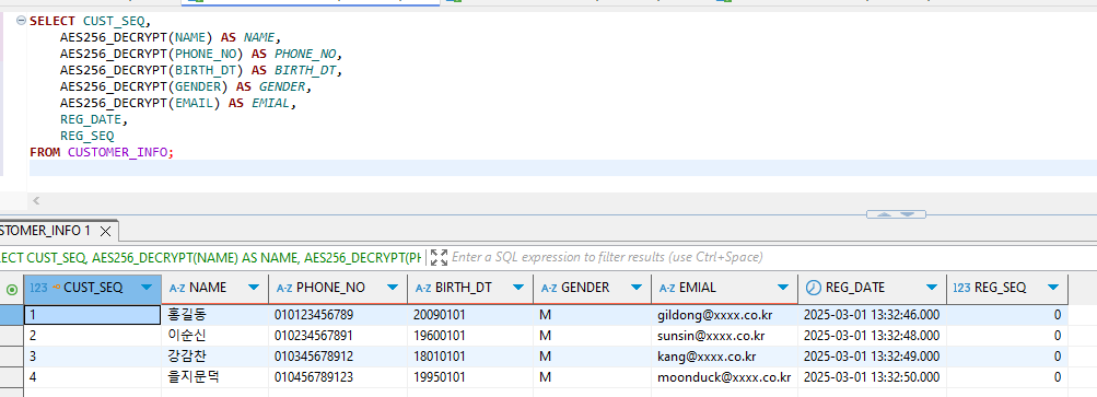 INSERT INTO CUSTOMER_INFO (NAME, PHONE_NO, BIRTH_DT, GENDER, EMAIL, REG_DATE, REG_SEQ) VALUES (AES256_ENCRYPT('홍길동'), AES256_ENCRYPT('010123456789'), AES256_ENCRYPT('20090101'), AES256_ENCRYPT('M'), AES256_ENCRYPT('gildong@xxxx.co.kr'), CURRENT_TIMESTAMP(), 0);