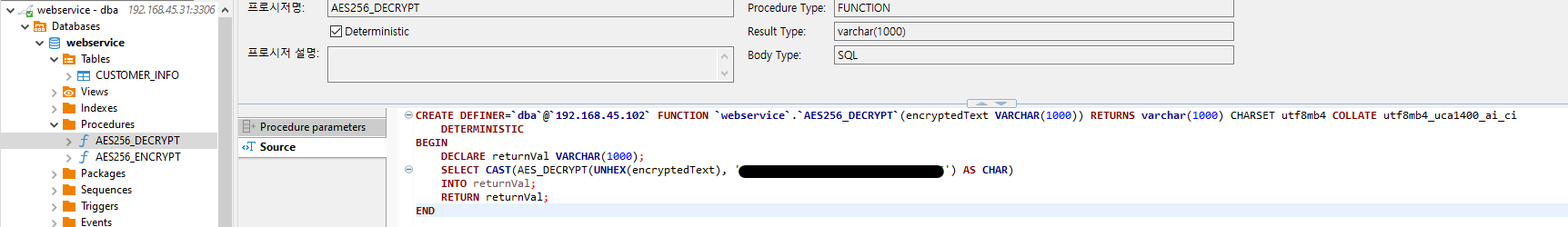주의 : 위 글의 내용에도 있지만 function을 생성 하고 수정 할 수 있는 DBA권한을 가진 계정에서 생성하고 일반 사용자와는 권한을 분리해야 하는 점입니다. 일반 사용자에게도 모든 권한을 부여한다면 암호화 키가 노출 되는 문제가 발생합니다.