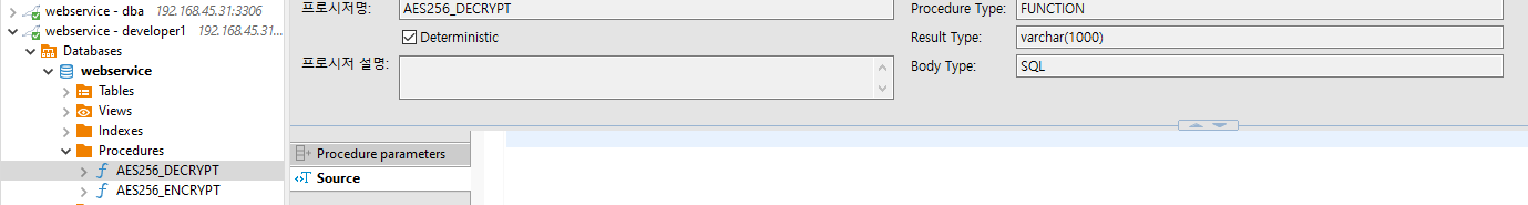 모든 권한이 있는 dba@192.168.45.102 계정의 function 소스 보기