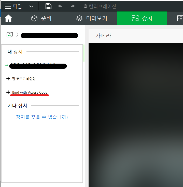 5.3. 장치 텝으로 이동 -> 프린터 추가 -> Bind with Access Code 선택