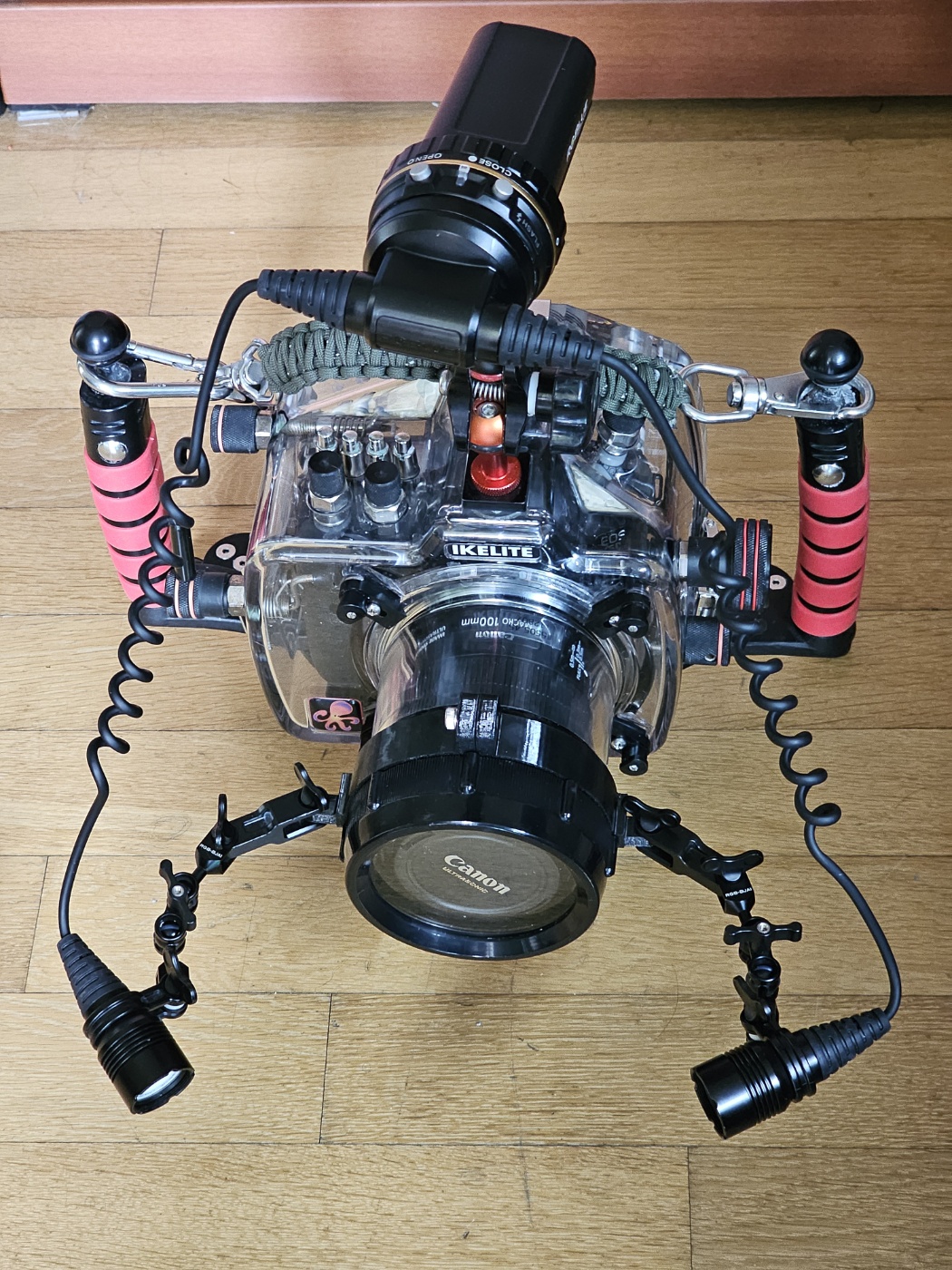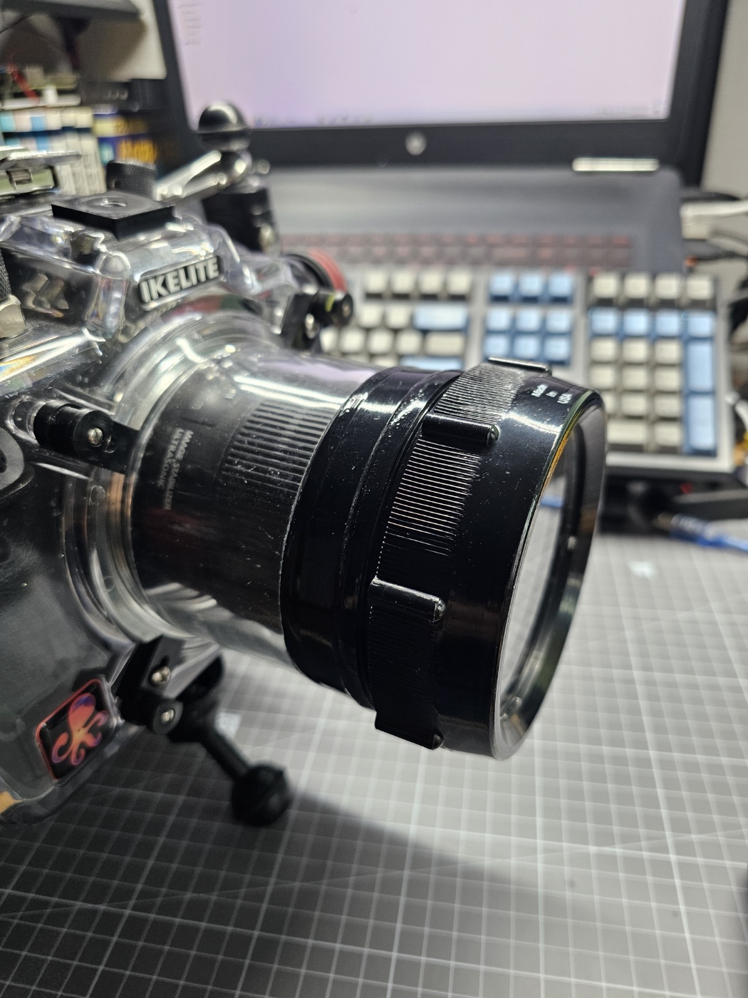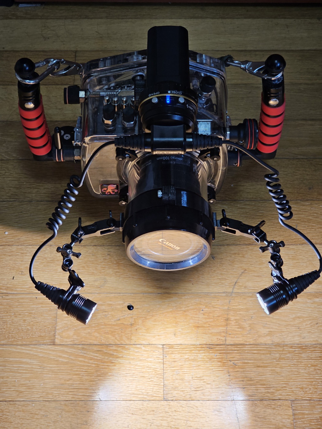 다만... 라이트도 렌즈도 67mm 나사식 마운트라 제가 사용하는 구형 아이켈라이트 4Lock 방식 평포트에는 마운트를 할 수 없었습니다. 아마도 나사식 마운트가 나오기 전에 모델이거나, 4Lock 의 채결방식이 스프링으로 브라켓을 지지하는 형태라 경통에 무게가 걸리면 누수의 위험성이 있기 때문에 렌즈 경통에 무언가를 달 지 못하도록 한 것 아닐까 싶습니다.