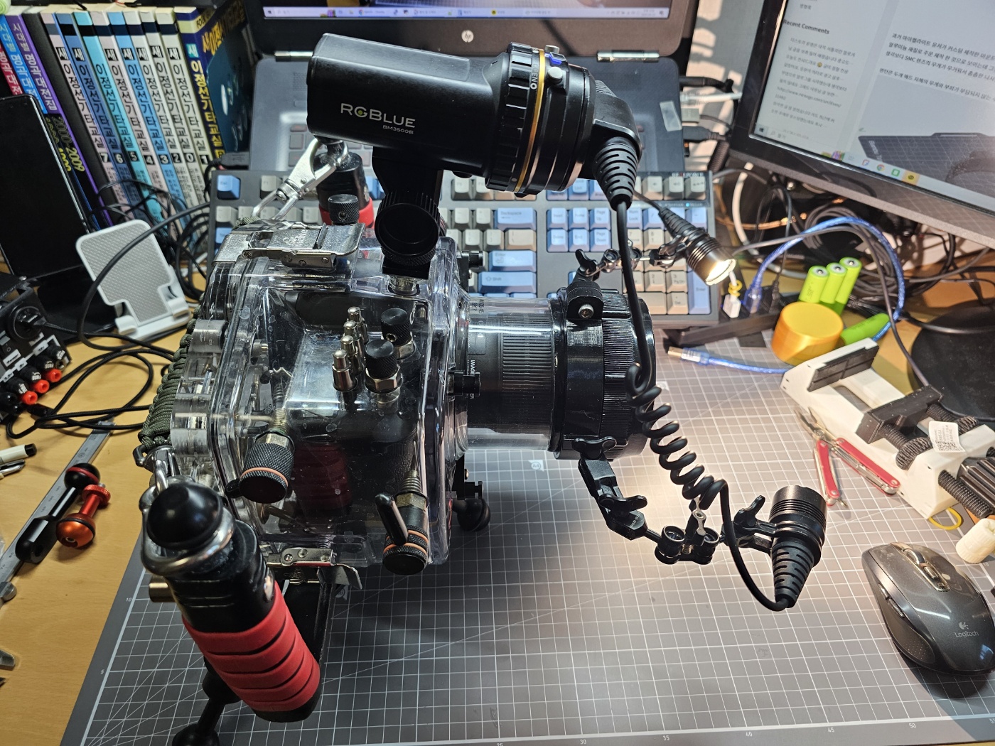 일단 구매한 라이트와 베터리, 마크로렌즈 까지 채결한 모습입니다.