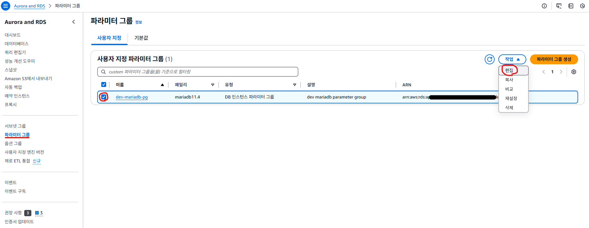 파라메터 그룹을 생성하지 않은경우 새로 만들고 데이터베이스와 연결 해야 합니다.