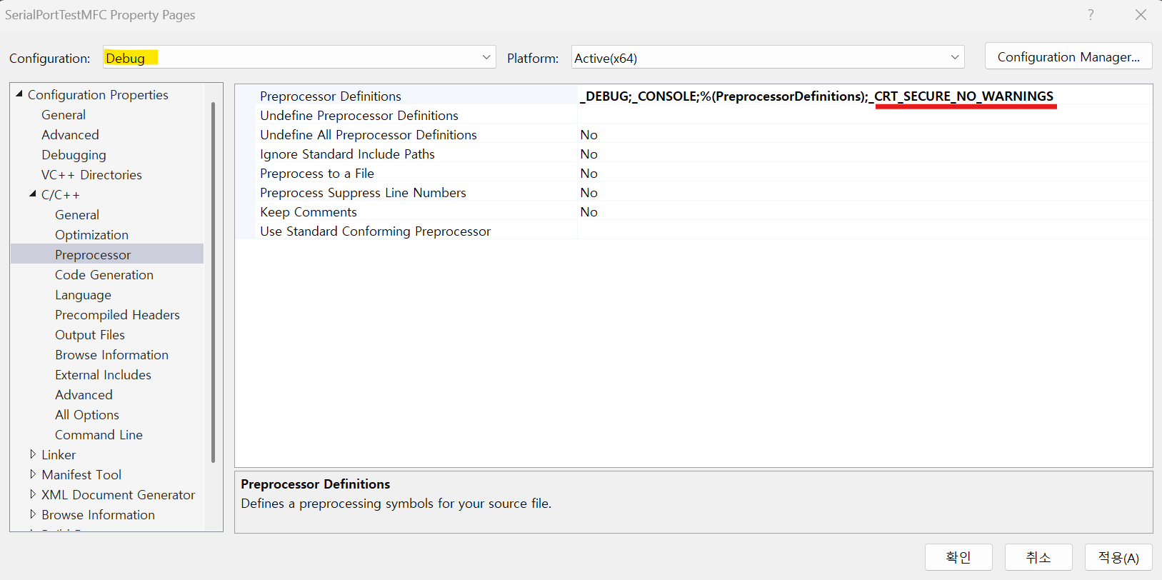 3. Preprocessor Definitions(전처리기 정의)에 항목 추가 기존에 내용이 있으면 ; 로 구분