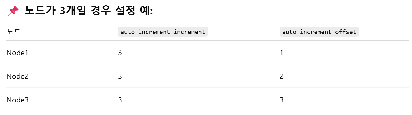 다만, 이렇게 하는 경우 노드별로 각 배수로 자동 증가값이 설정 되기 때문에 자동증가 값에 이가 빠질 수 밖에 없습니다.