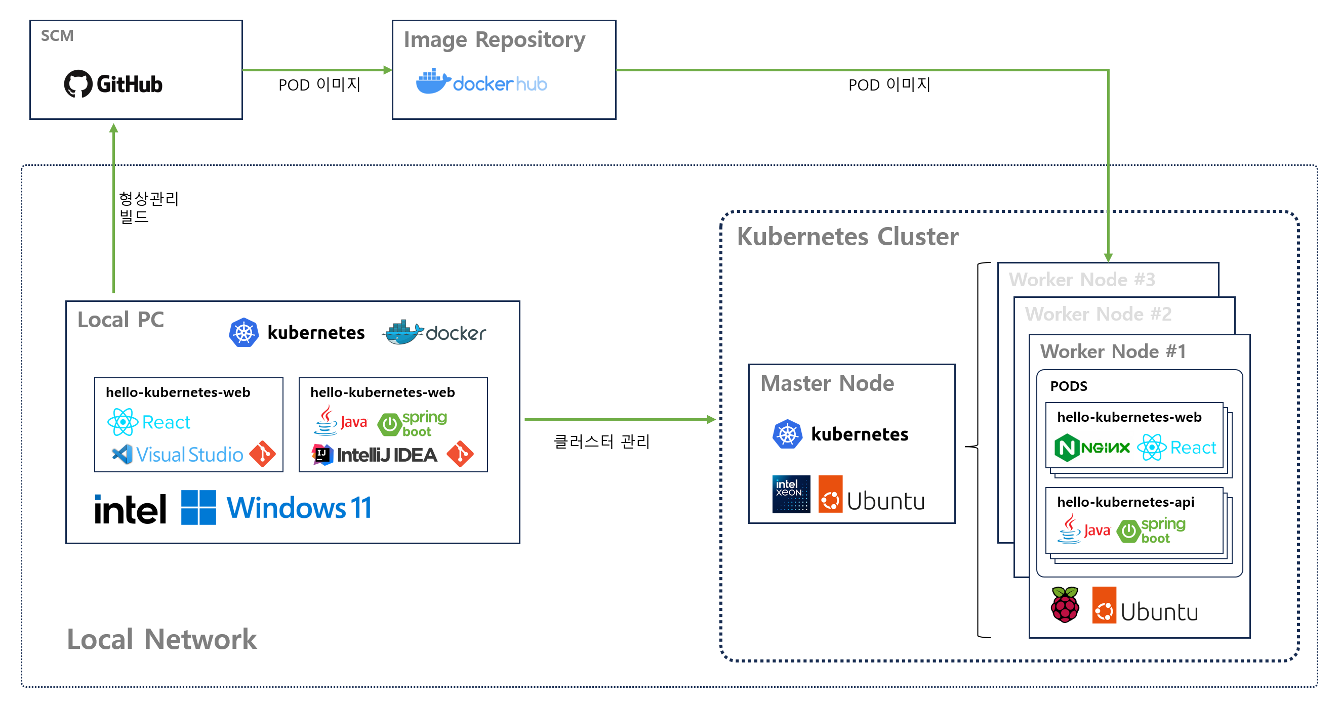 OS 설치 부터 네트워크 구성, 쿠버네티스 클러스서 구성, 도커 연계, 간단한 Spring boot 앱 배포, Git Hub Actions 와 도커를 연개해서 지속적인 배포, 제온서버와 라즈베리파이 3대로 작은 서비스를 운영 할 수 있는 쿠버네티스 환경을 구축해 보았습니다.
