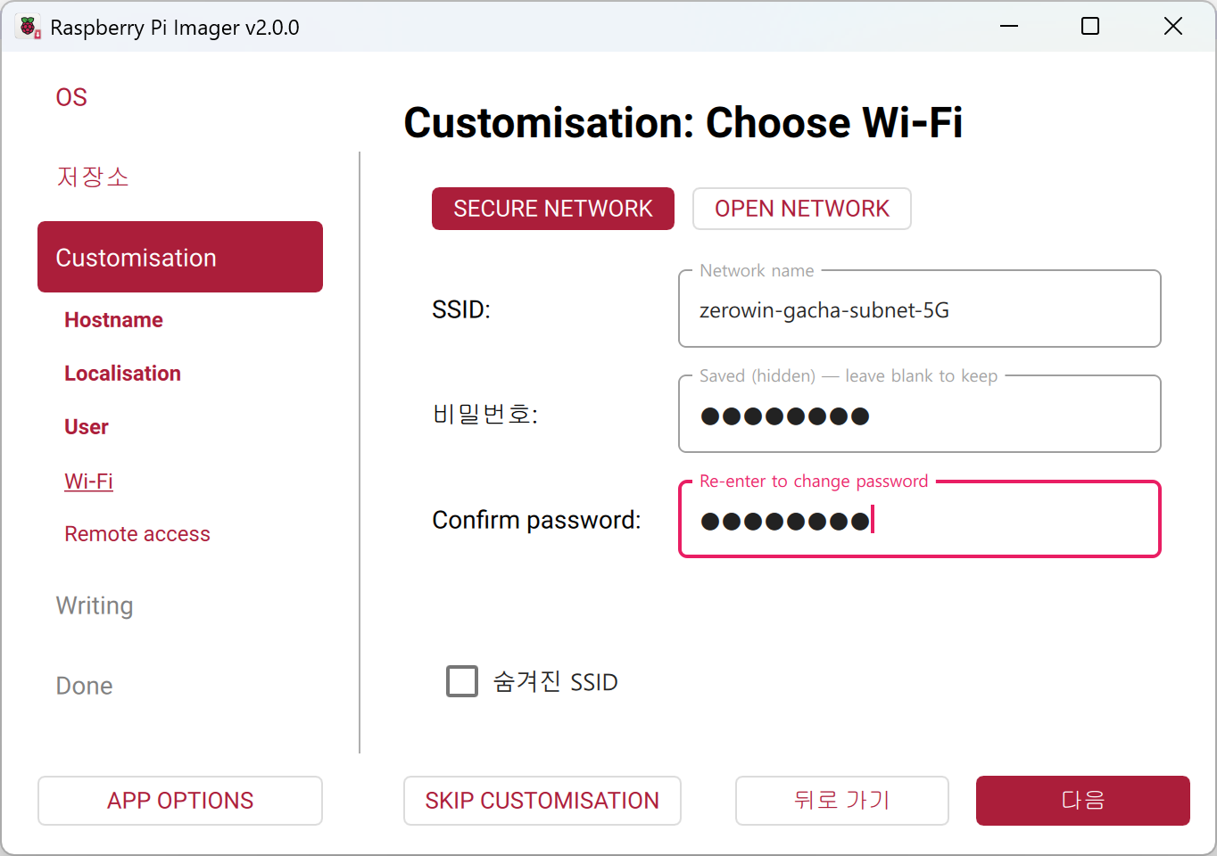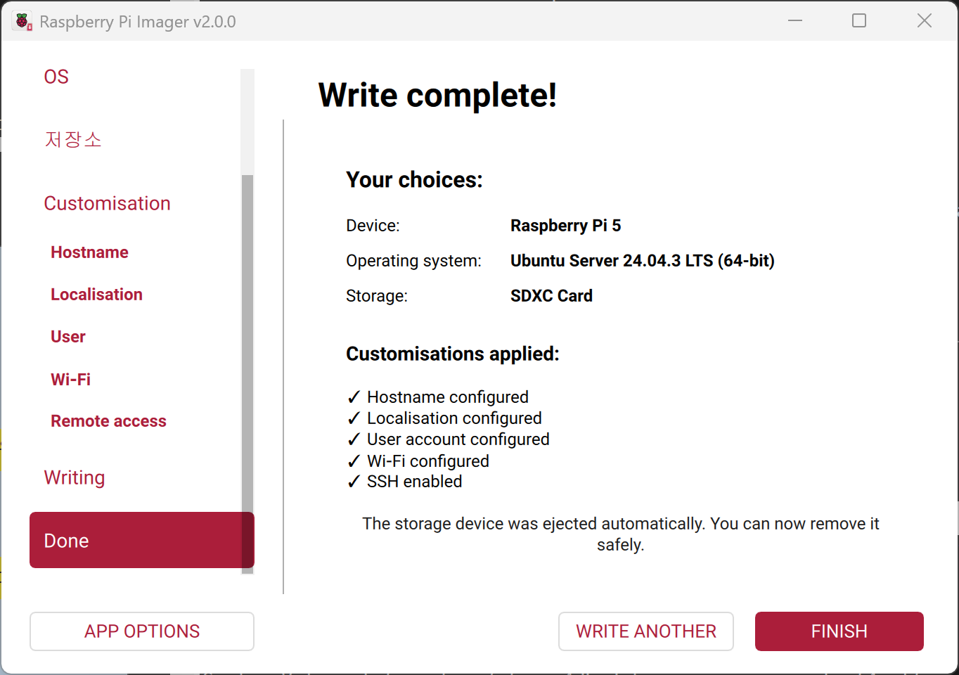 FINISH 클릭 후 메모리 제거 해서 라즈베리파이 5에 장착 후 부팅