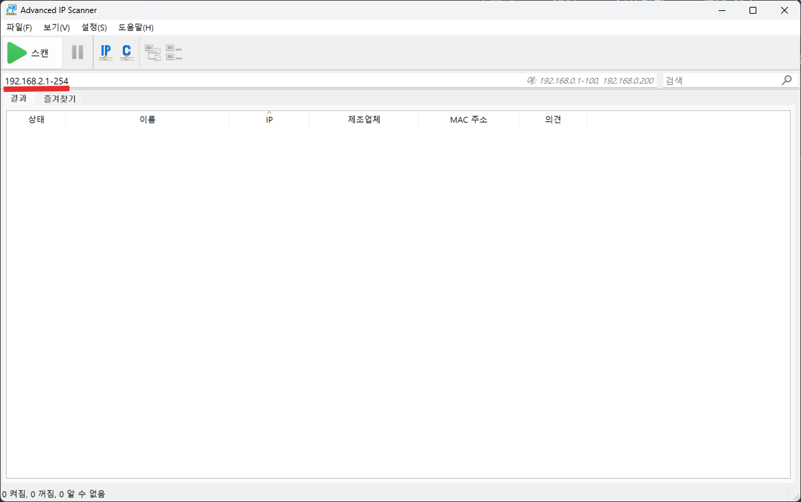IP 범위 확인 후 [▶스캔] 버튼 클릭