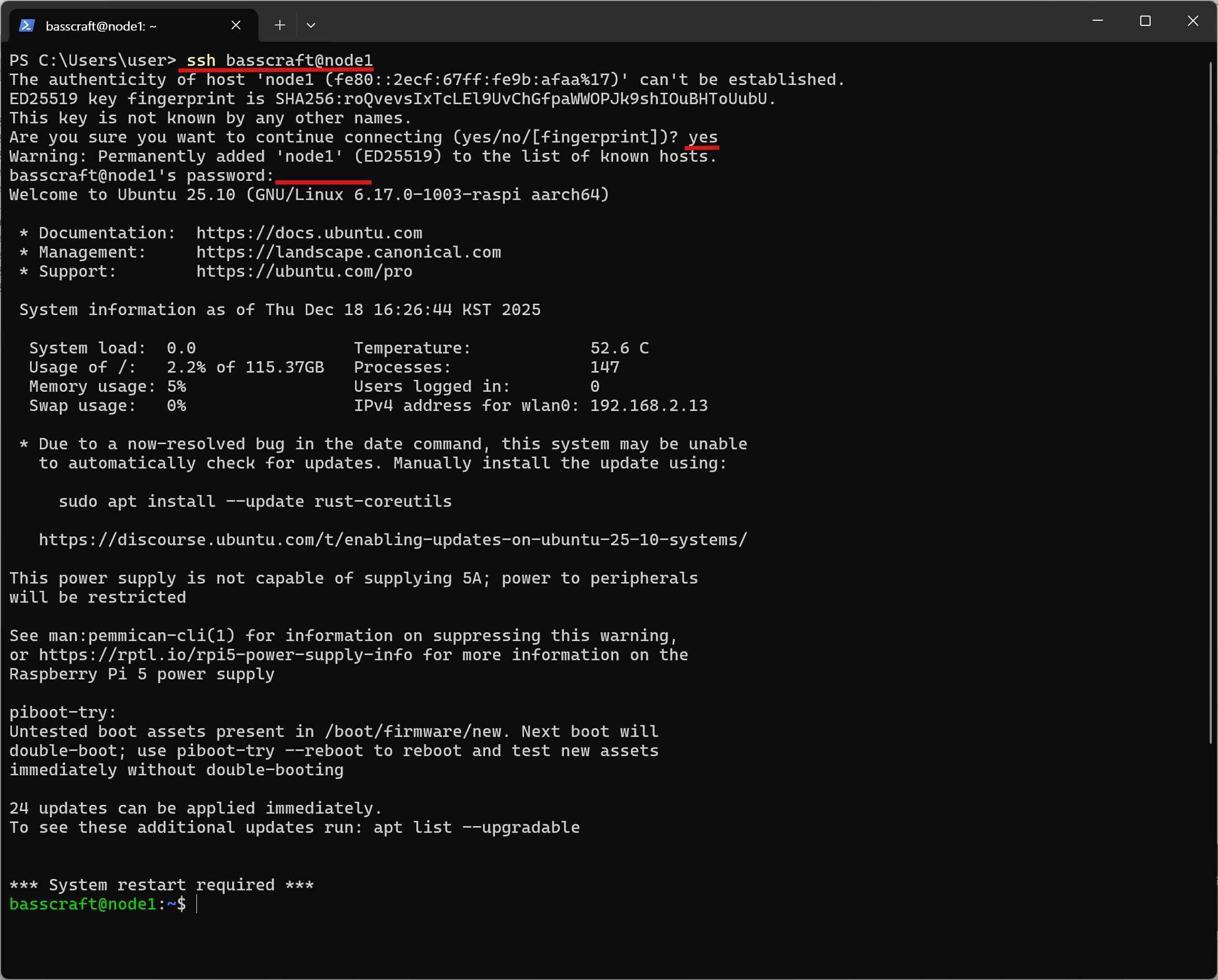 yaml 파일의 내용이 정상적인 경우 새로운 IP에 대한 SSH 키 저장 메시지가 나오고 정상 접속이 됩니다.