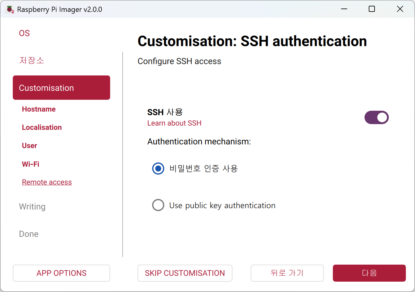 설치 후 SSH로 접근 할 예정이므로 SSH 사용을 활성화 한다.