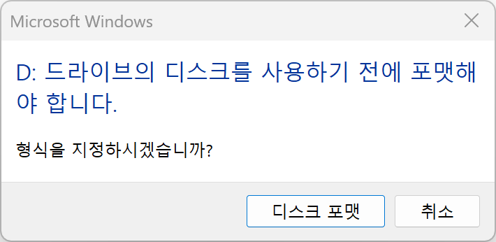 저장장치에 리눅스용 파티션을 하므로 윈도우에서 아래와 같은 경고창이 나옵니다.