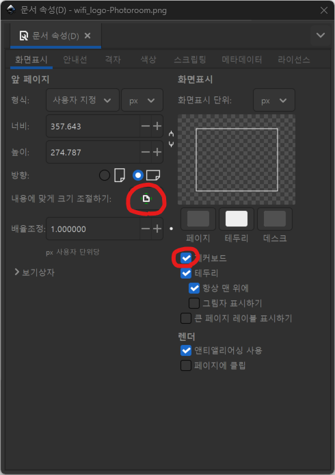 체커보드 선택 하면 배경이 투명한지 판단하도록 격자 모양으로 보여집니다.